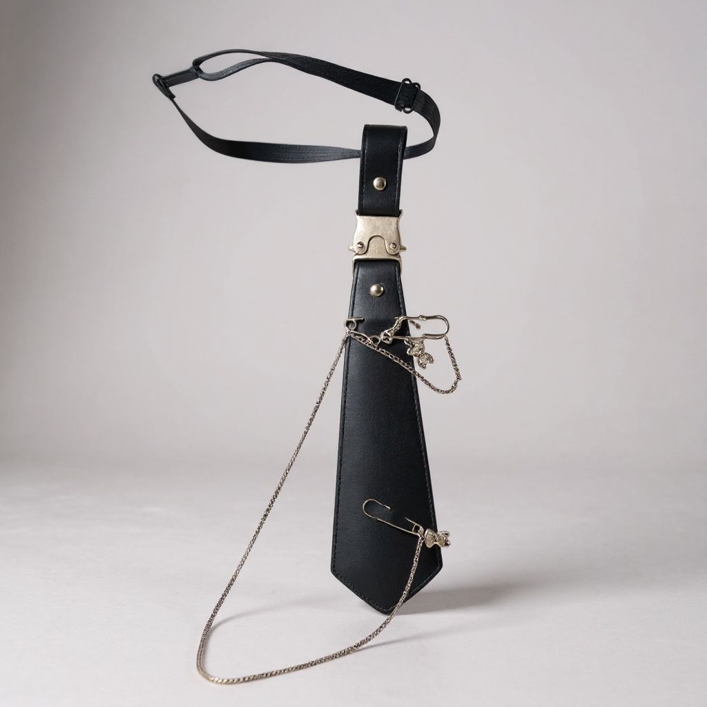 This is the tie that refuses to play by the rules — the Chain Reaction Tie. Sleek black faux-leather with silver-tone safety pin hardware and dangling chains, it’s equal parts chaos and elegance. The elastic strap means it slides on instantly, no fuss, no knots — just raw attitude.